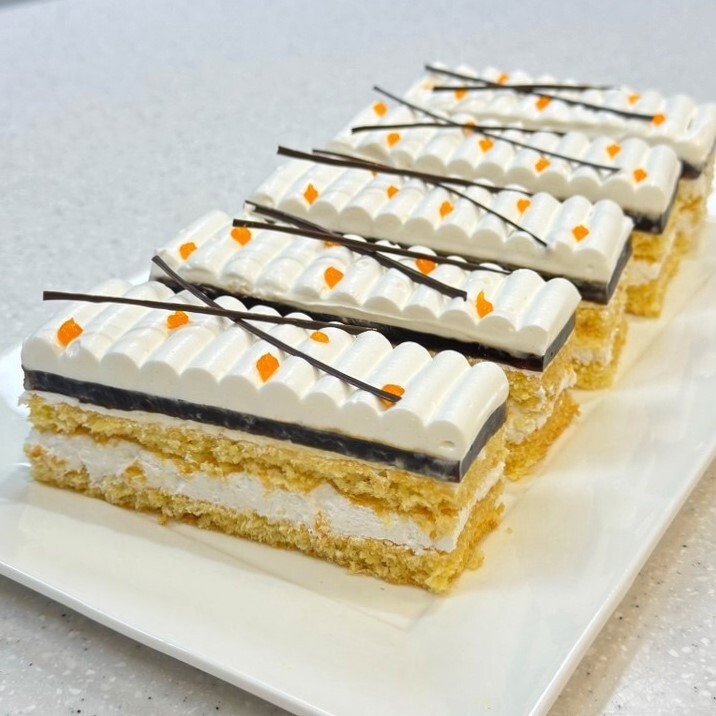 Готовый бисквит разделить на 2 части. Смазать первый корж кокосовым кремом и накрыть вторым бисквитом, нанести небольшое количество крема на верхний корж и охладить. Вылить подготовленное желе поверх заготовки и заморозить. Сверху с помощью кондитерского мешка с круглой насадкой отсадить отделочный крем и снова охладить. У готового пласта обрезать края и нарезать на прямоугольные пирожные. От декорировать пирожные кондитерской глазурью