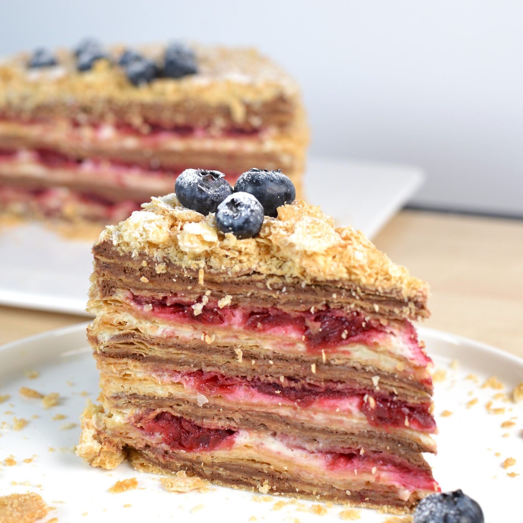 2 слоя шоколадного крема, 2 слоя ванильного крема, слой начинка Anabelle с вишней 35%, снова 2 слоя шоколадного крема, 2 слоя ванильного крема, слой начинки с вишней, снова 2 слоя шоколадного крема и 2 слоя ванильного крема. Бока торта обмазываем ванильным кремом и обсыпаем слоеной крошкой.